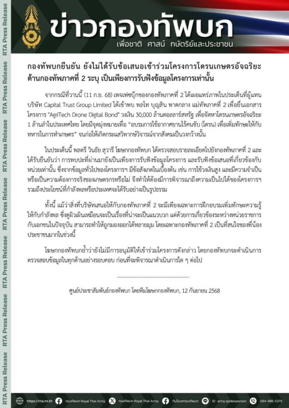 จากกรณีที่วานนี้ (11 ก.ย. 68) เพจเฟซบุ๊กของกองทัพภาคที่ 2 ได้เผยแพร่ภาพในประเด็นที่ผู้แทนบริษัท Capital Trust Group Limited ได้เข้าพบ พลโท บุญสิน พาดกลาง แม่ทัพภาคที่ 2 เพื่อยื่นเอกสารโครงการ “AgriTech Drone Digital Bond” วงเงิน 30,000 ล้านดอลลาร์สหรัฐ เพื่อจัดหาโดรนเกษตรอัจฉริยะ 1 ล้านลำในประเทศไทย โดยมีจุดมุ่งหมายเพื่อ “อบรมการใช้อากาศยานไร้คนขับ (โดรน) เพื่อเพิ่มทักษะให้กับทหารในการทำเกษตร” จนก่อให้เกิดกระแสวิพากษ์วิจารณ์จากสังคมเป็นวงกว้างนั้น