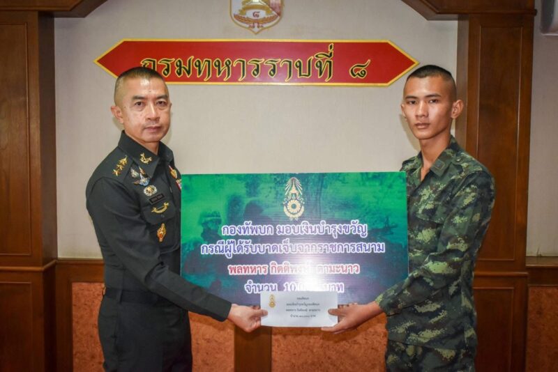 พันเอก สุพรเทพ ไชยยงค์ ผู้บังคับการกรมทหารราบที่ 8 เป็นประธานในพิธีมอบเงินบำรุงขวัญและเงินช่วยเหลือให้แก่ พลทหาร กิตติพงษ์ ดามะนาว กำลังพลสังกัดกองร้อยเครื่องยิงหนัก กรมทหารราบที่ 8 ซึ่งได้รับบาดเจ็บจากการปฏิบัติภารกิจป้องกันประเทศ บริเวณชายแดนไทย–กัมพูชา
