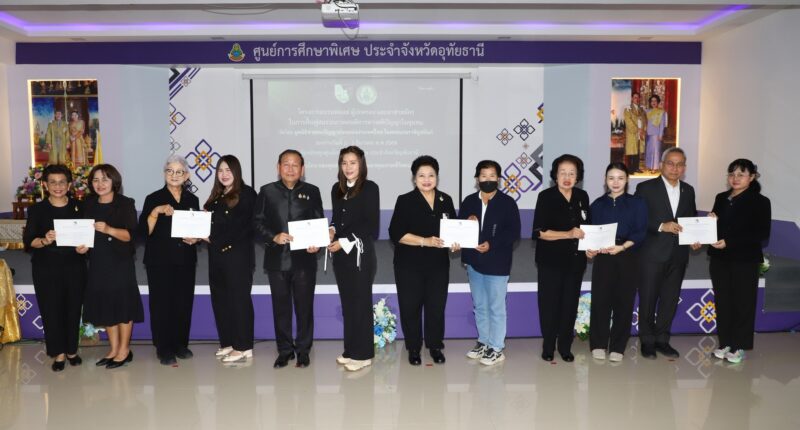 โดยมีดร.สายสม วงศาสุลักษณ์ ประธานมูลนิธิช่วยคนปัญญาอ่อนแห่งประเทศไทย ในพระบรมราชินูปถัมภ์ คุณนฤมล ปาลวัฒน์ เลขาธิการมูลนิธิฯ คุณกันยา ไชยเศรษฐ์ ประธานศูนย์ฝึกอาชีพปัญญาคาร คุณอนุกูล ปีดแก้ว ผู้อำนวยการสำนักงานมูลนิธิฯ คุณสราญภัทร อนุมัติราชกิจ ประธานฝ่ายสังคมสงเคราะห์ คุณรัชดาภรณ์ เกิดภู่ ประธานฝ่ายประชาสัมพันธ์ คุณอมรศรี รัศมิทัต พัฒนาสังคมและความมั่นคงของมนุษย์จังหวัดอุทัยธานี พร้อมด้วยคณะเหล่ากาชาดจังหวัดอุทัยธานี พ่อแม่ผู้ปกครองและอาสาสมัครร่วมในพิธี ณ ห้องประชุมศูนย์การศึกษาพิเศษประจำจังหวัดอุทัยธานี